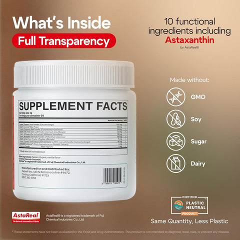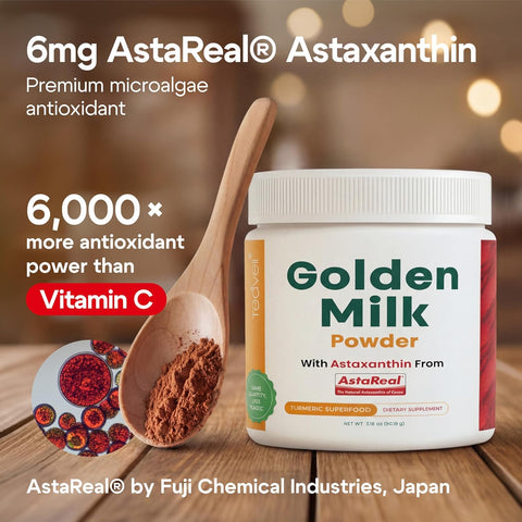 - THE ONLY GOLDEN MILK WITH ASTAREAL ASTAXANTHIN, 6,000X THE ANTIOXIDANT POWER OF VITAMIN C: Each serving of our golden milk powder delivers 6mg of AstaReal astaxanthin, the world’s most clinically studied natural astaxanthin brand, backed by 80+ human clinical trials. Astaxanthin provides antioxidant protection that turmeric alone cannot match, crossing both the blood-brain and blood-retina barriers to protect cells that other antioxidants simply can’t reach.