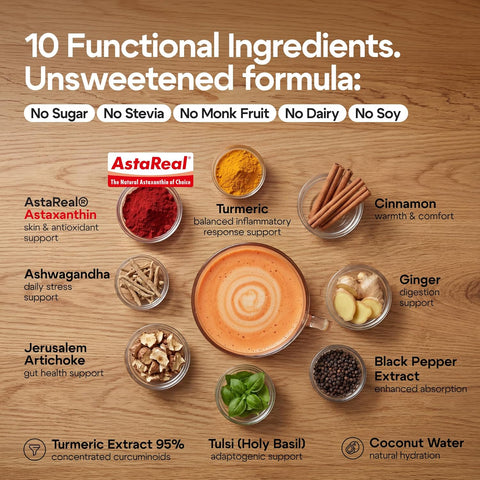 - HEALTHIER & DELICIOUS ALTERNATIVE TO TURMERIC GUMMIES: Most turmeric gummies rely on empty carbs, sugar (or artificial sweeteners), and minimal curcumin per serving. Our golden milk powder delivers a full-spectrum golden milk latte formula with 10 active ingredients, including AstaReal astaxanthin, and KSM66 Ashwagandha, in a delicious unsweetened latte you actually look forward to. No added sugar, and a daily ritual that feels like self-care, not a chore.